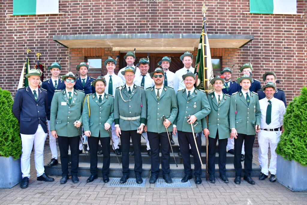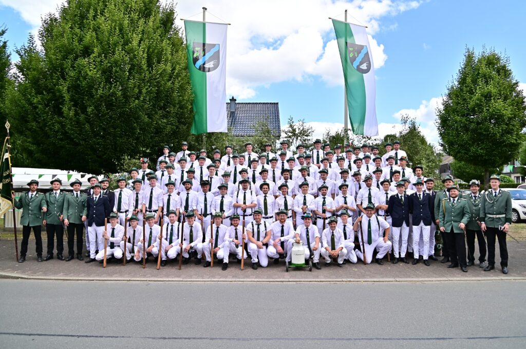 Die Übungsabende zu den Schützenfesten waren vielleicht nicht mehr ganz so streng wie früher, dafür aber bestimmt so lang. Seit 1988 war zu jedem Schützenfest am Samstagnachmittag vor dem Antreten ein Foto von der gesamten 1. Kompanie an der neuen Kirche gemacht. Zu diesem Zeitpunkt sind die Hosen der Schützen noch weiß und die Hemden rein.
